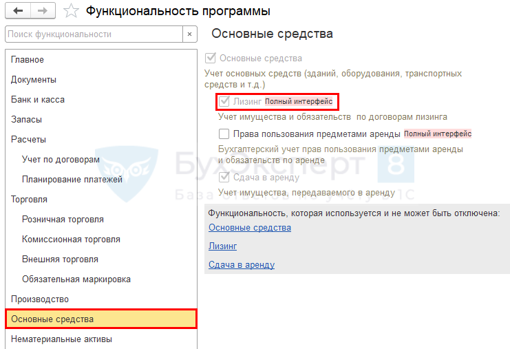 Итак, решили мы учесть актив на своем балансе. Первым делом, как при готовке сложного блюда, проверяем, есть ли у нас все «продукты». То есть, активирован ли у нас функционал по лизингу. Идем в «Главное меню» -> «Настройки» -> «Функциональность», вкладка «ОС и НМА». И смотрим, стоит ли галочка напротив заветного слова «Лизинг». Если нет — ставим! Без этого наш кулинарный шедевр не получится.