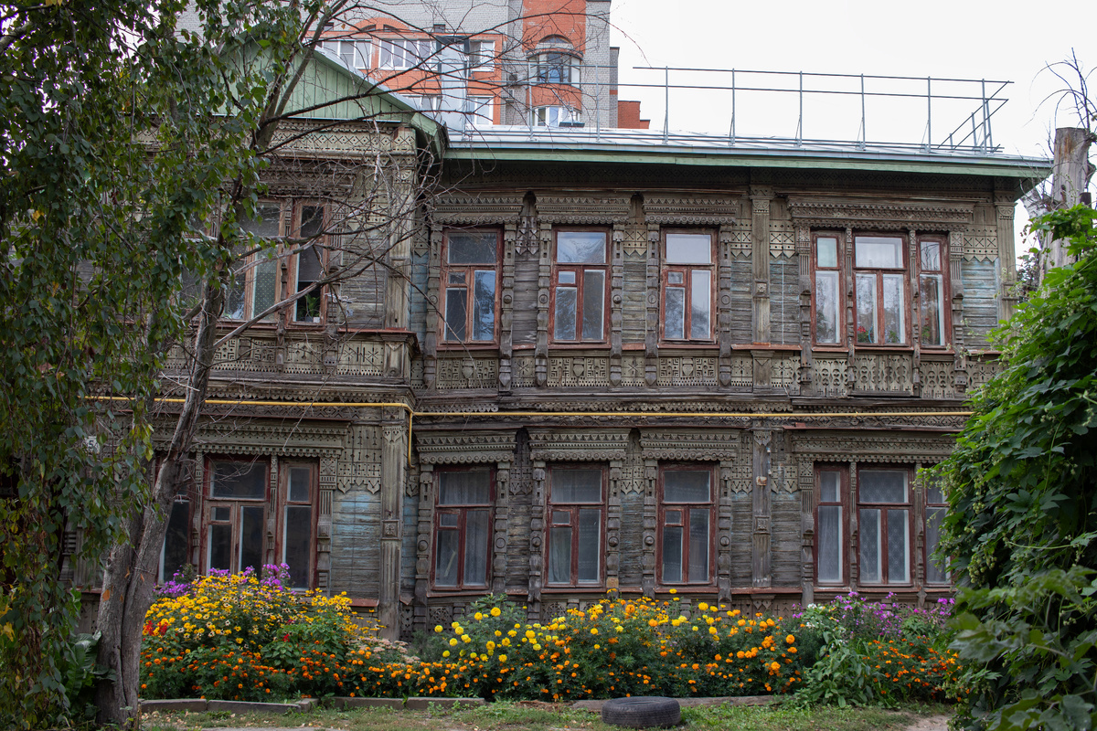 Немного удивительно, что интересный дом, внешний вид фасада которого так напоминает рекламируемое сейчас всякими «Резиденциями традиций» михайловское кружево, остается в стороне от туристических маршрутов. Вот сколько ни прохожу мимо, никогда не замечал, чтобы к усадьбе Анастасии Козловой на улице Пожалостина в Рязани приводили туристов. Расположенную неподалеку усадьбу купца Селиванова – гиды постоянно показывают гостям города. А дальше все проходят мимо первого рязанского «небоскреба» и идут себе дальше в сторону Кремля. Отходишь немного в сторону – уже тишина. Тихий центр города. Вот и стоит себе тихо дом, весь в резьбе, незаметно во дворе. Так получилось, что дом с красивой резьбой – главный дом этой купеческой усадьбы выстроили не на главной улице, а в глубине участка. На улицу выходит флигель, который внешне не настолько примечателен, да и жизнь его осовременила, обзавела пластиковыми окнами. С домом №7 по улице Пожалостина такие номера провернуть не получится – он попал в список
