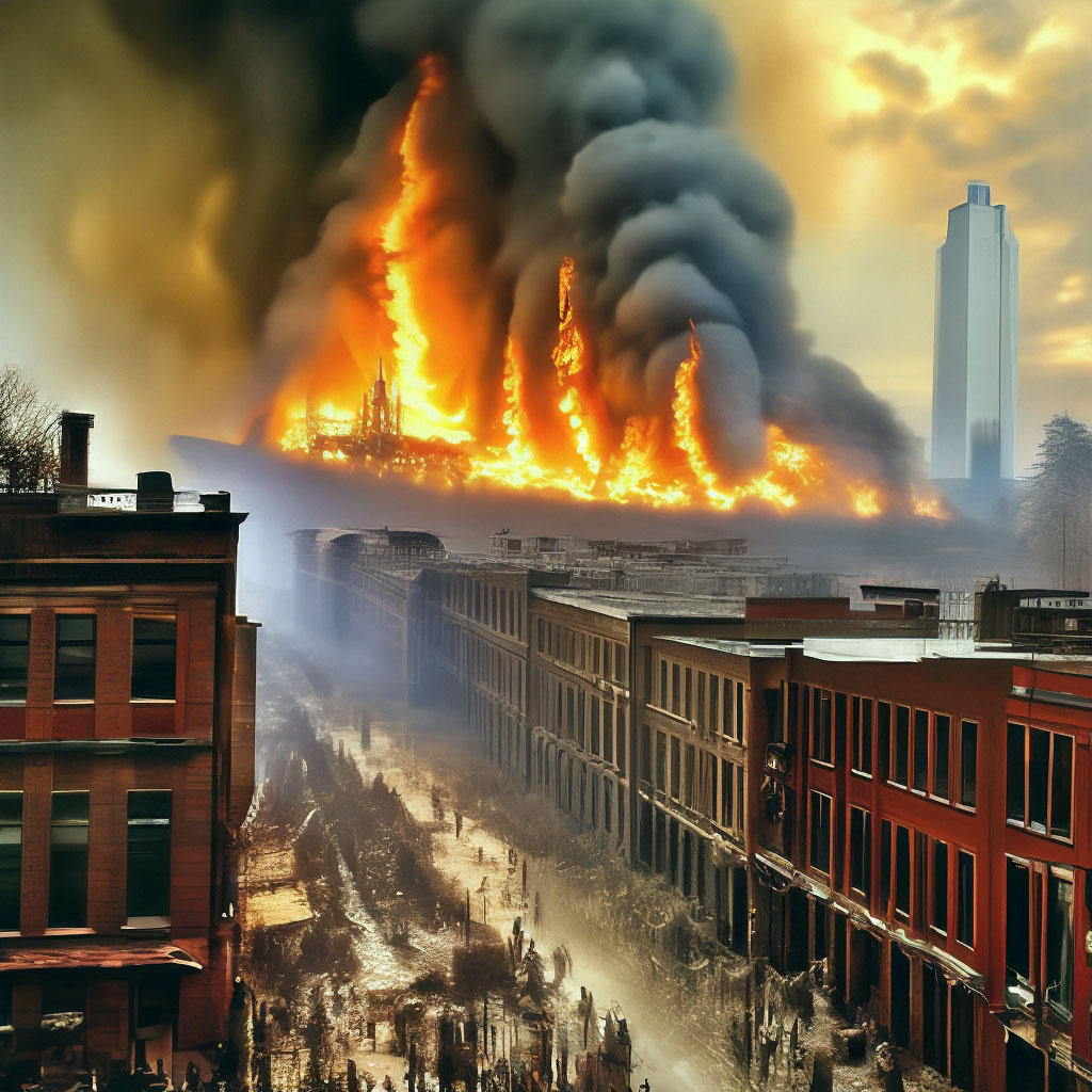 Чикаго той осенью был пороховой бочкой, ждущей спички. Город был построен в основном из дерева, включая тротуары и крыши. Лето выдалось необычайно сухим, дождей почти не было, и сильный юго-западный ветер был готов раздуть любой огонёк до размеров ада. Пожар начался около девяти вечера в воскресенье, в густонаселённом иммигрантском районе на западной стороне города. Огонь, подгоняемый ураганным ветром, быстро перерос в огненный шторм, который пожирал всё на своём пути. Он перепрыгивал через реку Чикаго, уничтожая деловой центр, роскошные отели, оперный театр и особняки богачей. Когда через два дня пламя наконец унялось, выгорев дотла, оно оставило после себя пустыню площадью почти в девять квадратных километров, унесло жизни по меньшей мере 300 человек и сделало бездомными 100 тысяч — треть населения города.