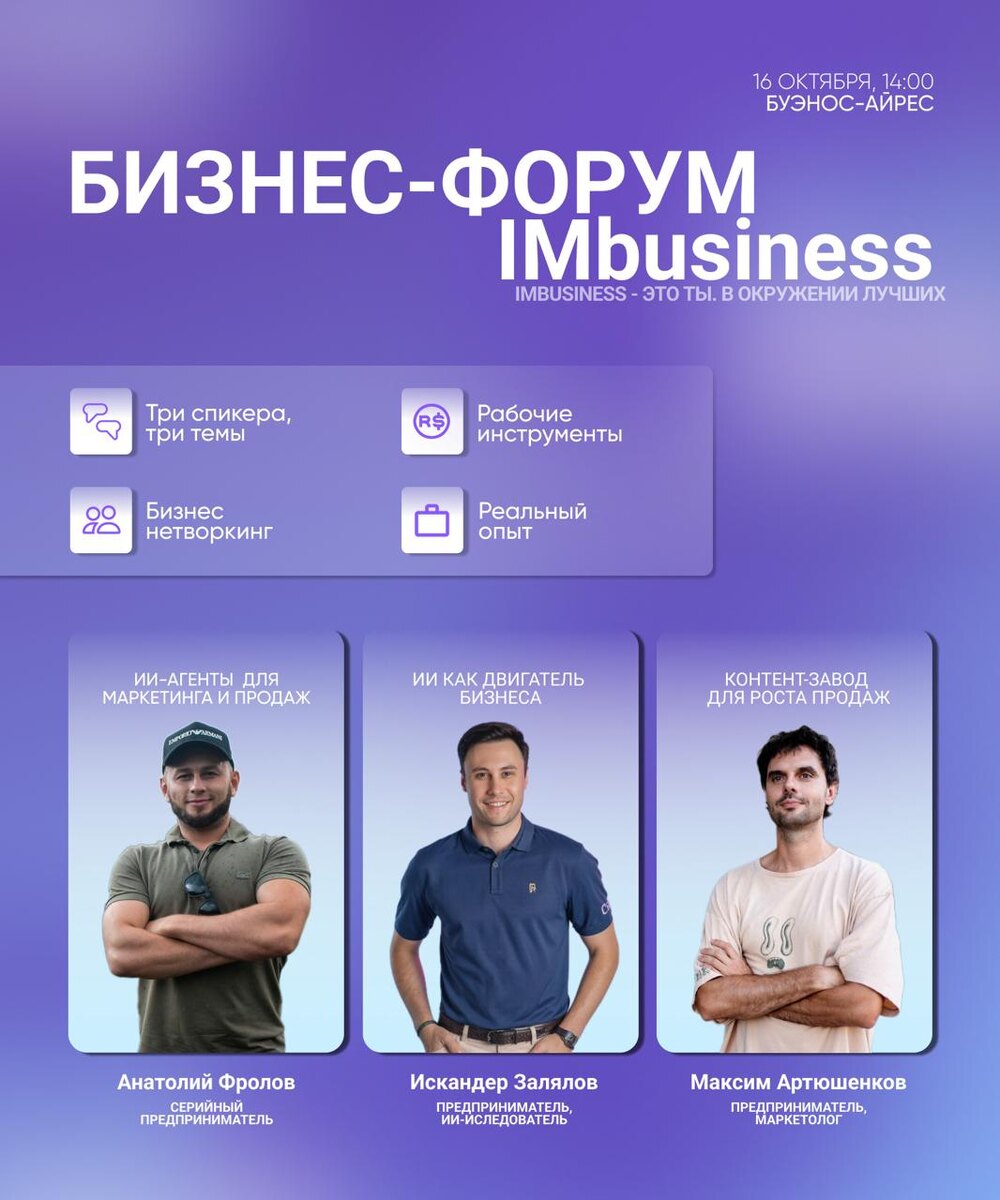 Всем привет, наши друзья проводят второй бизнес форум, собирают предпринимательское сообщество Байреса и не только. Всем кто ищет полезные контакты или давно искал бизнес комьюнити тут, рекомендуем быть ) IMbusiness-форум - точка роста для вашего бизнеса 🚀 16 октября, 14:00–17:30 Innovation Lab Темы: Автоматизация бизнеса через ИИ и контент-завод - практические решения, которые можно внедрить сразу 🎙 Живые кейсы от практиков - без воды, только конкретика и рабочие шаги 🤝 Сильный нетворкинг - люди приходят знакомиться всерьёз и надолго 🎁 Полезные подарки от спикеров - чтобы старт был быстрее Узнать подробности и купить билеты: @IMbusiness_forum_bot Если ранее Вы пользовались ботом, нажмите в меню слева команду "Перезапустить бота"