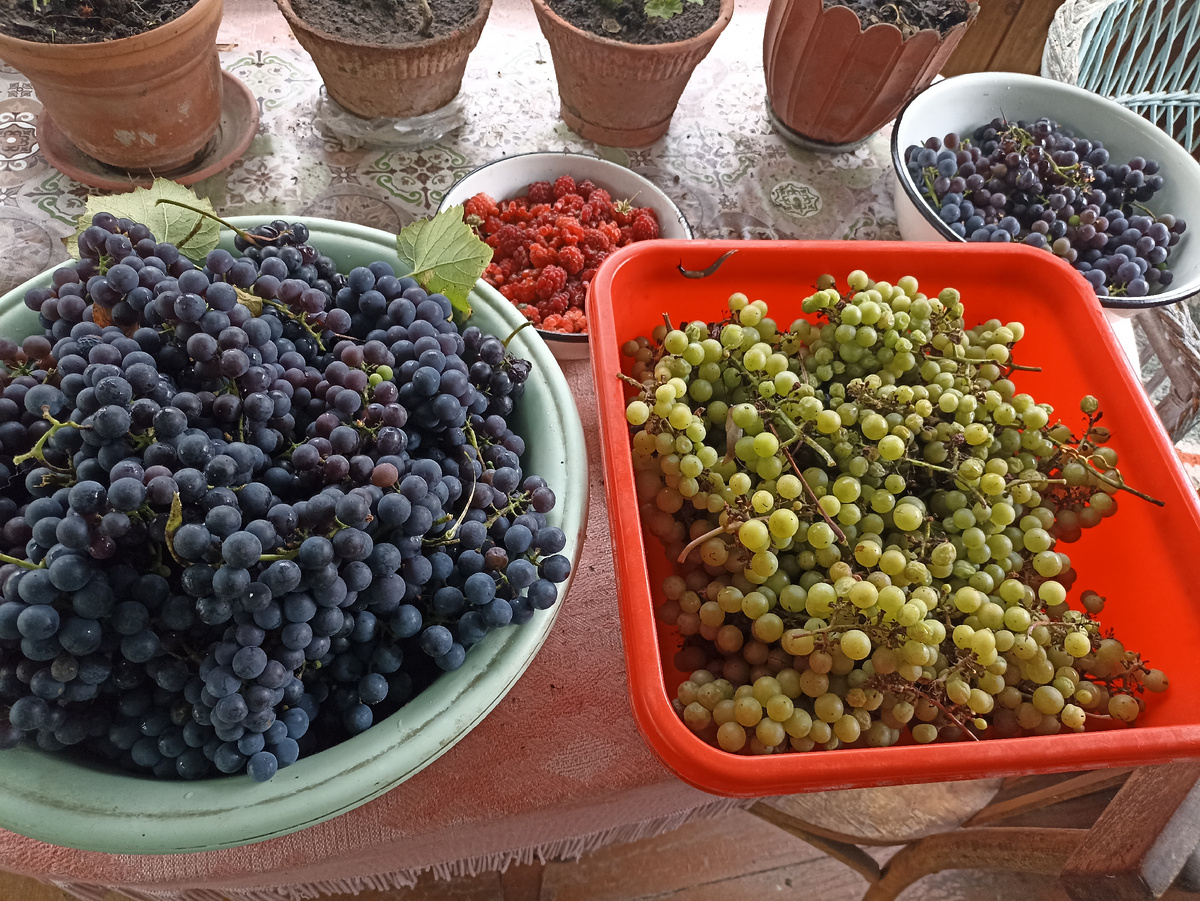 ... столько и полопали... 😋 Подзаработали мы с мужем сегодня 1 100 рублей, совсем невзначай... Что ж, приятный бонус!!! Не остались мы на ночёвку у свекрови сегодня, много причин почему... Одна из причин, что на улице дождь, мы сидим дома... На улице и ничего не поделаешь, да и в доме особо не чем занятся... Развлекали себя разговорами... Рассказали кучу новостей друг другу, которые уже рассказывались по телефону... Сейчас позвонить и поболтать - это не проблема... Да!? В перерыве между дождём собрала у свекрови малину, частично виноград... Часть оставила себе, часть мне отдала... Зелёный виноград - сладкий... Но ему чуток не хватило времени вызреть... Чёрный кисло - сладкий... Раньше, когда свекр жив был, они со свекровью вино домашнее ставили... Очень вкусное у него получалось прям... Вино никогда не покупали, было своё... домашнее... Короче, привезла я целое ведро винограда домой... Теперь думаю, что с ним делать... 🤔 Банок у меня нет, чтобы компот закручивать... И мо