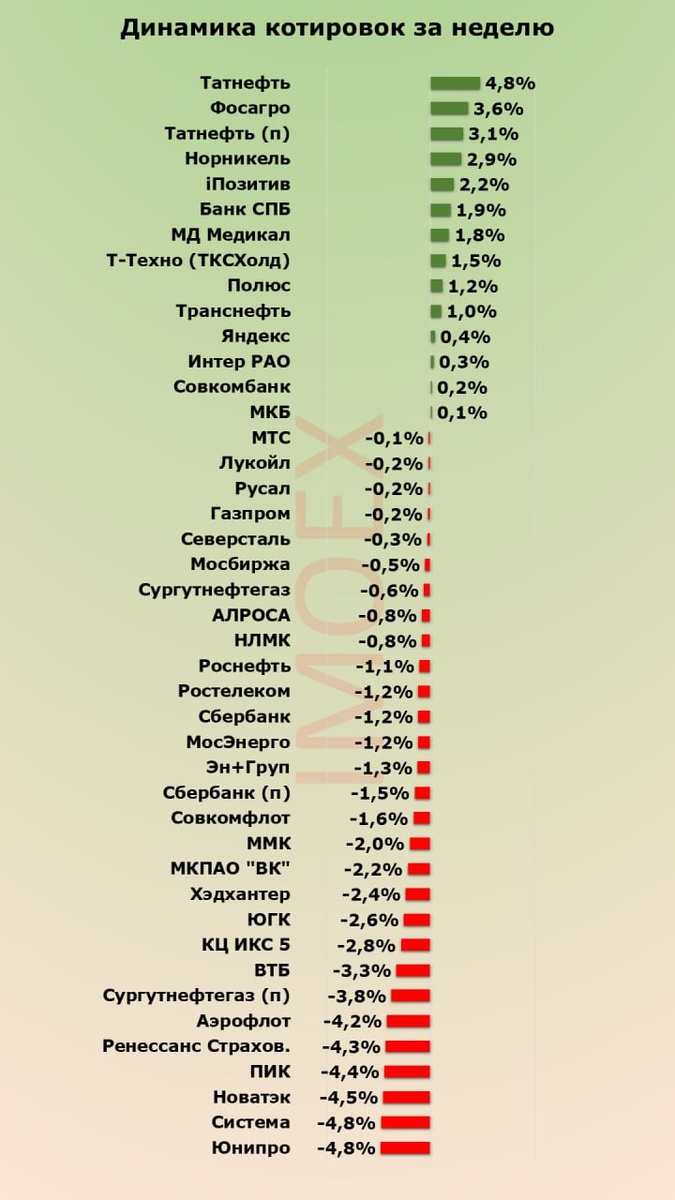 ⤴️ Татнефть-ао +4,8% ⤴️ ФосАгро +3,6% ⤴️ Татнефть-ап +3,1% ⤴️ Норникель +2,9% ⤴️ Позитив +2,2%