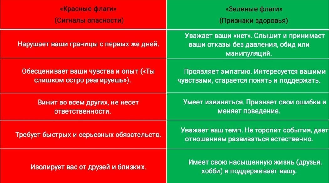 После травмы легко превратиться в «сыщика», который ищет только «красные флаги» — признаки опасности. Это истощает и не дает увидеть хорошее. Попробуйте сместить фокус на поиск «зеленых флагов» — признаков психологически зрелого человека.