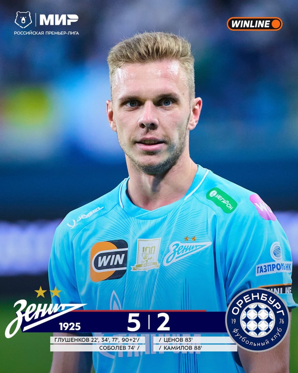 🔥 Яркий выдался матч! «Зенит» победил «Оренбург» в десятом туре РПЛ — 5:2. В составе победителей покер оформил Максим Глушенков (22, 34, 77, 92-я минута). Ещё один гол команды забил Александр Соболев (74-я). У «Оренбурга» отличились Эмил Ценов (83-я) и Владислав Камилов (88-я). «Зенит» набрал 19 очков и занимает третье место в турнирной таблице чемпионата страны. На счету «Оренбурга» семь очков и 13-я позиция. 😔 А в другом матче дня «Ростов» и «Краснодар» не смогли забить голов — 0:0. @russian_rt_sport