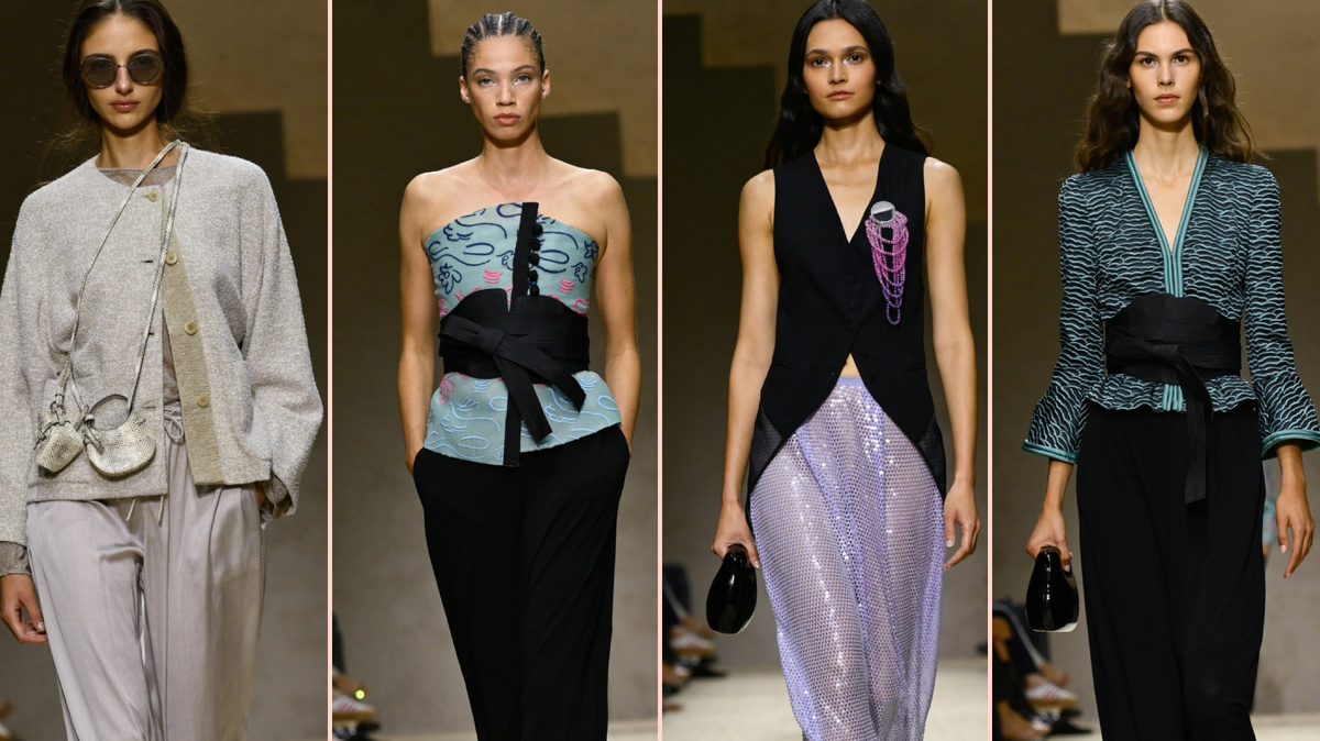 Этот великолепный показ начался с песочных, медных нейтральных оттенков и закончился фейерверком. Показ был одновременно тяжелым и легким. Тяжелым, потому что это была последняя коллекция Джорджио Армани для Emporio, и потому что никто не вышел на поклон в конце. Зрители ждали и ждали, некоторые вытирали слезы со щек, но никто не появился в конце подиума, где декорации напоминали ступени зиккурата или ацтекского храма. Вдохновением для коллекции послужило то волшебное, промежуточное время, когда путешественники возвращаются в город после отпуска, все еще находясь под впечатлением от всего увиденного и пережитого - и до того, как реальность вступит в свои права. Это также отразило любовь Армани к путешествиям и влияние на его коллекции разных стран мира. Дизайнер, умерший в сентябре, запечатлел это мечтательное состояние в великолепном по темпу показе, который начался с песочных, медных нейтральных оттенков и закончился фейерверком. Это были брюки-гарем, платья-халтеры, бикин