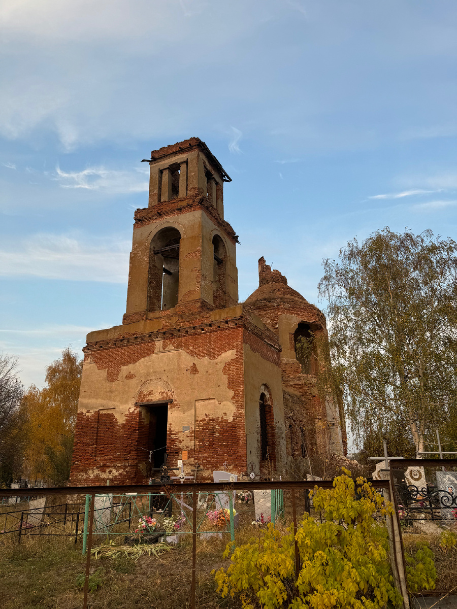 В Губарёво я оказалась по пути из Воронежа в Тулу. Село само по себе ничем особым не выделяется: центральная улица, школа, привычная для таких мест сельская жизнь. И посреди кладбища — пустующий храм. Церковь Богоявления Господня здесь появилась ещё в XVII веке: в 1657 году построили деревянный храм, его перестраивали в 1701 и в 1800 годах. А каменное здание, которое дожило до наших дней, было возведено в 1800-м на средства помещика Ивана Иоакима Невежина. Храм задумывался трёхпрестольным: главный престол во имя Богоявления Господня, приделы — Казанской иконы Божией Матери и Михаила Клопского. Колокольня была ярусной, массивной — типичный памятник архитектуры своего времени. В советское время храм закрыли, и с тех пор он стоит пустой. С 1995 года его статус вроде бы звучит солидно — объект культурного наследия областного значения. Но реальность простая: полуразрушенные стены, следы укрепительных работ только в отдельных местах, и всё то, что обычно сопровождает заброшенные святыни.
