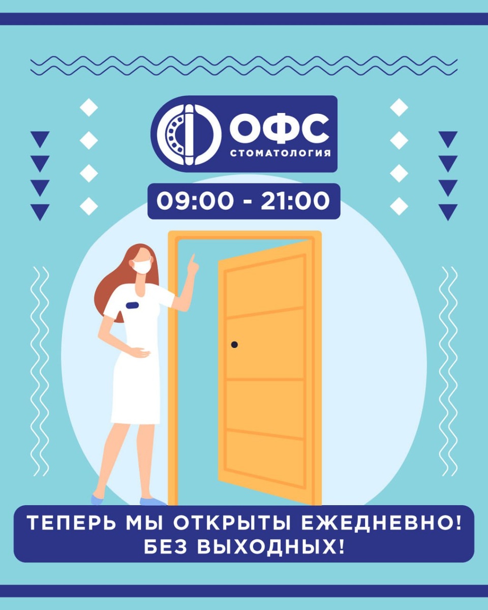 Отличная новость для наших пациентов! С завтрашнего дня «ОФС Стоматология» будет открыта каждый день с 09:00 до 21:00. Мы знаем, как важно попасть на приём в удобное время, поэтому расширили график — так, чтобы каждый мог выбрать подходящий для визита день. Приходите в те дни, когда это удобно именно вам! Напоминаем наши контакты для записи в клинику: 📌 г. Москва, ул. Всеволода Вишневского, д. 4. 📞 +7(958)807-76-01 📞 +7(495)197-89-49 📱 https://t.me/ofsstom 🌐 https://ofs.team/