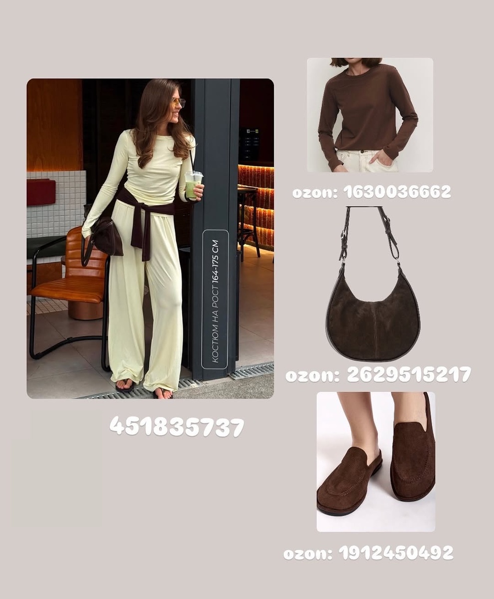 Иногда для безупречного вида достаточно трёх вещей: мягкой базы, продуманного цвета и пары акцентных аксессуаров. На фото — два универсальных комплекта для города: первый строится на контрасте сливочного и шоколадного оттенков, второй — на чистоте молочного тона. Ниже — разбор каждого предмета строго по артикулам, с детальными описаниями и советами стилиста.