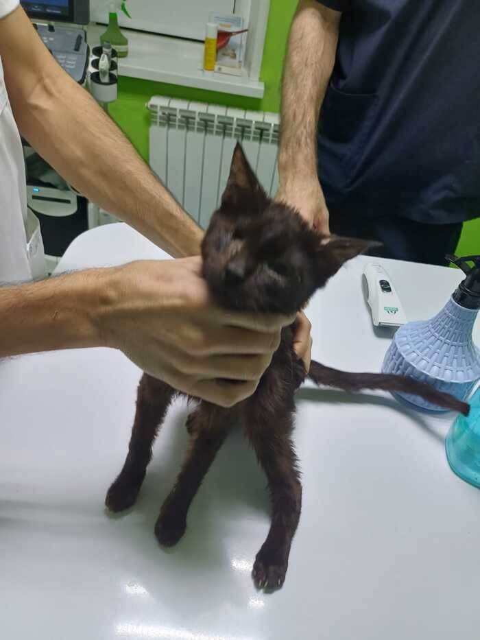 Таким Гвидо попал в приют. очень худенький, прямо невесомый...лапки, как тростинки. Но ему на тот момент было месяцев 8-9. Оба глаза были закрыты.. После осмотра выяснили что в наличие только один больной глаз, второго нет...только пустая глазница. Кот, оказался очень ласковым и умным. Быстро привык к своему имени, дружил со своим товарищем по несчастью Хяккимару, так как его братишку Туэрто быстро забрали домой.