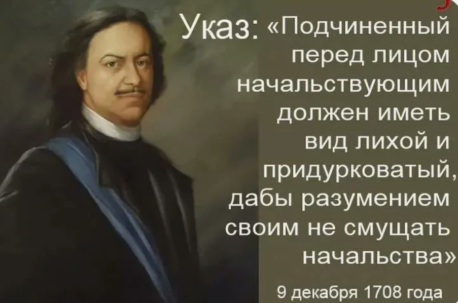 В интернете и даже некоторых СМИ часто цитируют якобы указ Петра I от 9 декабря 1708 года: «Подчинённый перед лицом начальствующим должен иметь вид лихой и придурковатый, дабы разумением своим не смущать начальство». Эта фраза стала мемом, а многие верят, что царь-реформатор действительно требовал от подданных «туповатой» покорности. Но так ли это на самом деле? В этот день Пётр I подписал указ о создании первых 8 губерний, разделив страну на крупные административные единицы. Реформа укрепляла вертикаль власти, улучшала сбор налогов и набор рекрутов. Никаких упоминаний о «придурковатом виде» в документе нет — только сухие списки городов и обязанностей губернаторов. prlib.ru «Указ о лихом виде» — типичный исторический фейк, созданный для стёба. Но его популярность показывает: даже спустя 300 лет петровские реформы остаются частью культурного кода, а мифы о них — поводом для рефлексии о прошлом и настоящем.