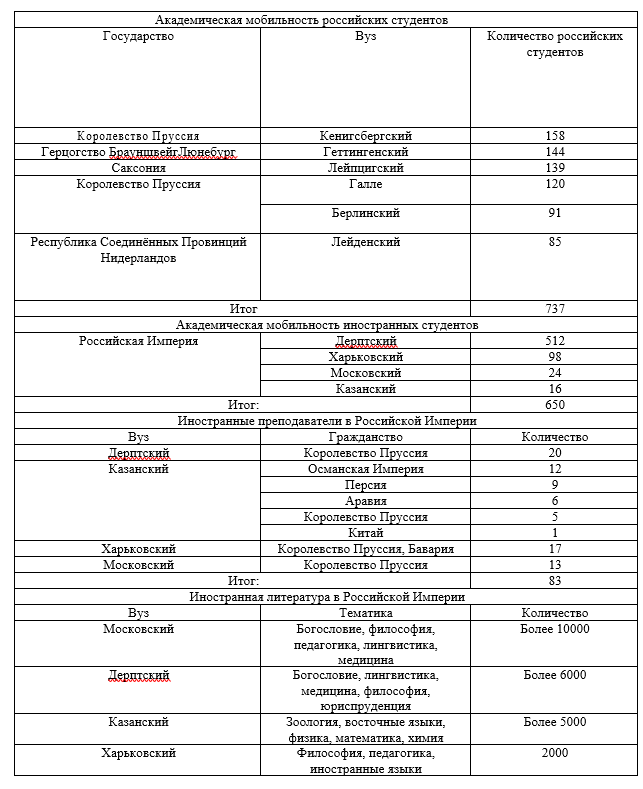 Таким образом, в период с 1801 по 1824 гг. российские студенты продолжали обучение в основном в немецких университетах. Преподаватели из Турции, Персии, Аравии, Германии и Китая читали лекции и вели семинары в России. В новых российских университетах: Дерптском, Харьковском и Казанском обучались иностранные студенты. В указанных 3 российских вузах совокупное количество иностранной литературы составляло 13000 экземпляров (см. таблица 2).