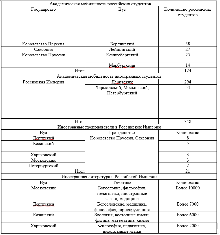Таким образом, в период с 1825 по 1861 гг. количество российских студентов, обучавшихся за границей существенно снизилось в сравнении с предыдущими этапами. Они обучались только в немецких университетах. Снизилось количество иностранных студентов и преподавателей в России. Увеличение экземпляров иностранной литературы зафиксировано только в Дерптском и Казанском императорских университетах (см. таблица 3).