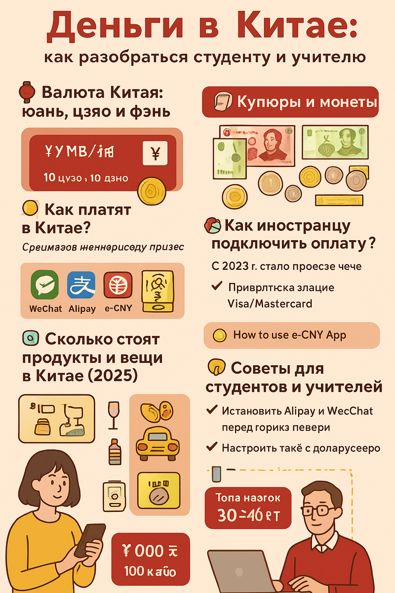 Если вы собираетесь в Китай учиться, преподавать или путешествовать, вопрос денег и оплаты — один из первых, с которым придётся столкнуться. Ведь в Поднебесной деньги — это не только купюры и монеты, но и целая цифровая экосистема 💻📱. В этой статье разберёмся, что такое юань, чем отличаются цзяо и фэнь, какие приложения нужны для жизни и как иностранцам не потеряться в мире QR-кодов. Официальная валюта — 人民币 (rénmínbì, Жэньминьби), что переводится как «народная валюта».
