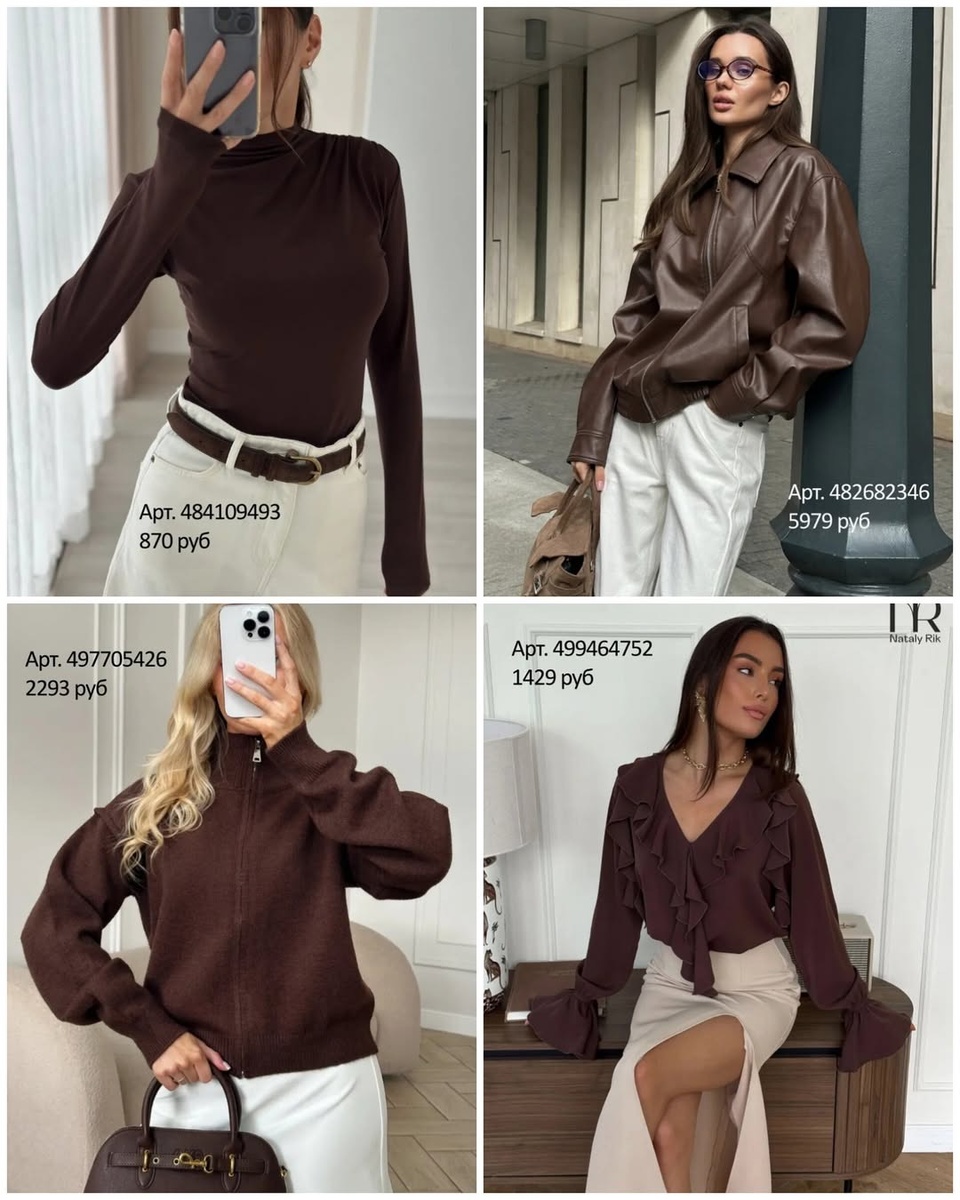 Эта шоколадная капсула собрана так, чтобы вещи взаимно усиливали друг друга: гладкие полотна подчёркивают рельеф вязки, замша смягчает кожу, а светлые низы освежают глубокий цвет верха. Держитесь правила трёх оттенков, следите за длиной низа и балансом объёмов — и каждый комплект с этими артикулами будет выглядеть спокойно, современно и заметно дороже своей цены.