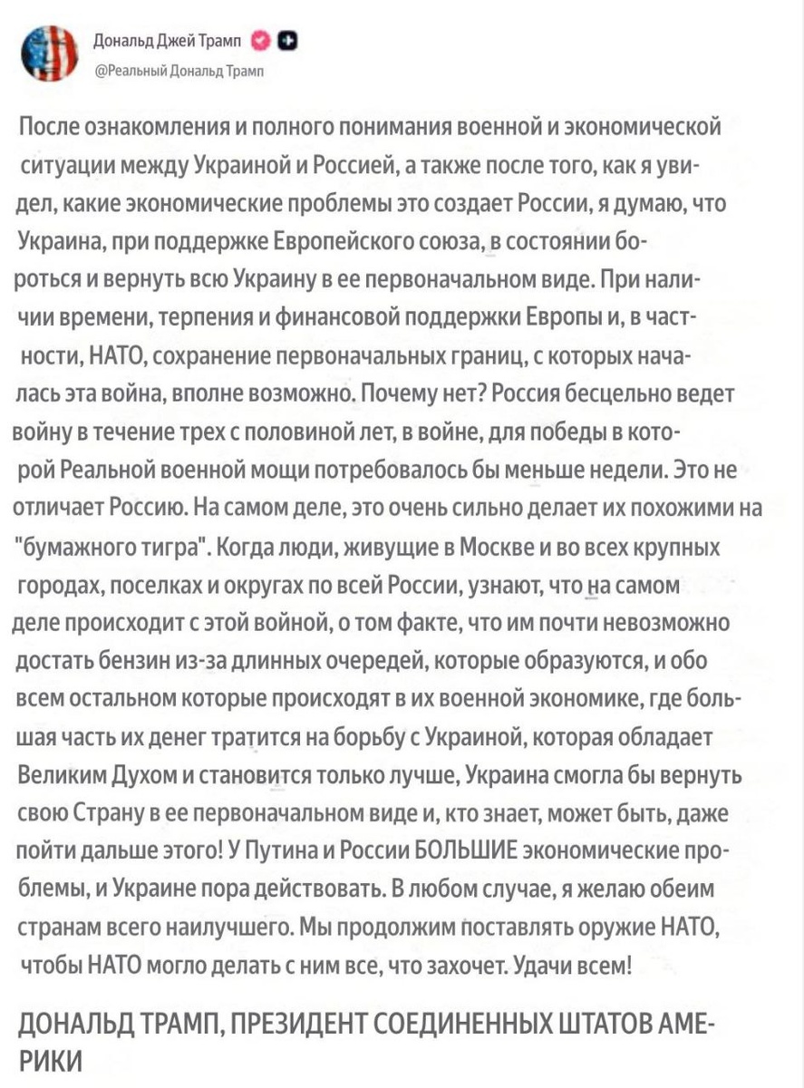 Сегодня уже пятый день, как на федеральных каналах и в СМИ не утихает истерика по поводу слов Трампа, опубликованных в соцсетях. Я по наивности думал, что это быстро прекратится, ведь президент США не сказал ничего нового: констатировал факты и объявил возможный вариант разрешения конфликта, который поддерживается мировым сообществом. Но нет, до сих пор тема остается горячей. Какие только эпитеты ей не придумали: от "предательства Трампа" до "разворота США на 180 градусов", и все с прилагательным "неожиданный". Ведь до этого, особенно после Аляски, телепузиков пытались убедить, что Трамп, если не друг, то сочувствующий РФ и приятель ВВП. Нашли и виновных – президента У. и Урсулу фон дер Ляйен, которые убедили президента США отойти от "пророссийской" позиции. Что же произошло на самом деле? На самом деле все идет по долговременному плану Трампа (я много раз писал об этом). Для него РФ – не очень значимая фигура в глобальной игре, которую он затеял. Я бы назвал ее "разменной", но боюсь о