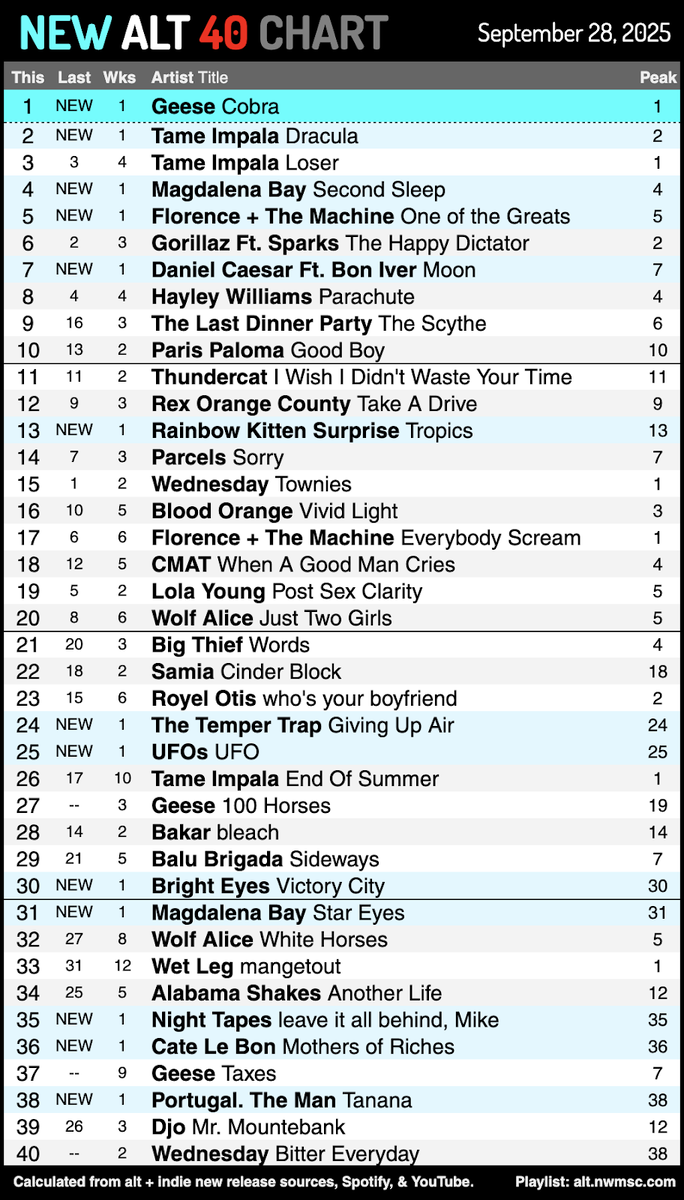 TAME IMPALA, MAGDALENA BAY, FLORENCE + THE MACHINE, DANIEL CAESAR FT. BON IVER и RAINBOW KITTEN SURPRISE также дебютировали новыми синглами в первой половине чарта.