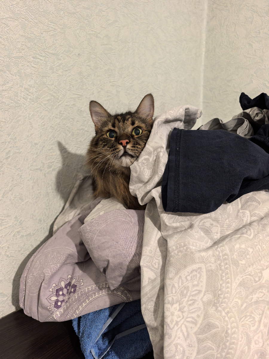 Всем привет! С вами Кузя Кусалочкин (он же царь Кузьма I). Сегодня я расскажу, как замечательно играл с хозяевами и как развлекаются другие людишки у нас в городе. Утро было не совсем обычным. Хозяйка встала аж в 8 часов. Я её не будил. Поэтому она и спала дольше. Пошла хозяйка на кухню и потеряла меня. Я не приходил за паштетиком, а в привычных местах меня не было. Нашли меня на балконе. Я там спал на старом стуле с подушками. На новые каналы я сейчас не подписываюсь. Дружить, забежать в гости времени нет. Через время соизволил выйти, поел паштетик с царской тарелки. Хозяйка в очередной раз навалила кучу и не убрала сразу. А я решил стать царём этой кучи: Посидел в куче, а потом мы с хозяином немного поиграли. И тут случилась подстава... Хозяйка меня схватила и стала делать лапикюр. Видите ли, когти у меня уже длинные, везде ими цепляюсь и царапаюсь. Я был в шоке, а потом начал возмущаться. Лёг в сторонке: И сделал уши как у филина: Надо смотреть в одну сторону, а в другие слушать