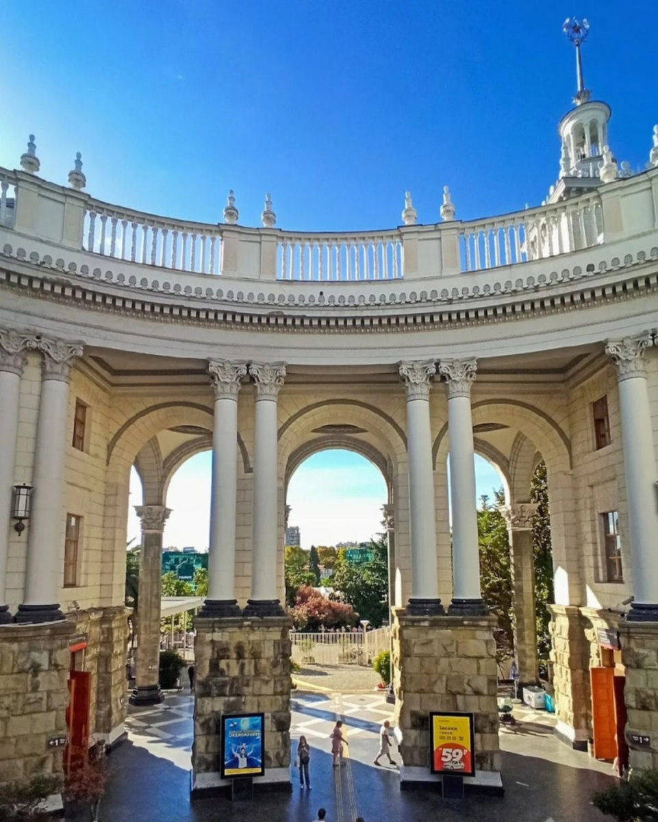 Посмотрите на это красивое здание! Это поистине самый красивый железнодорожный вокзал, который я когда-либо видела. Уютный и небольшой, но очень зелёный, с удобными кассами, залами ожидания и, конечно, архитектурой, которая очень интересная и вызывает лично у меня восхищение. Посмотреть это красивое здание нужно как историческую достопримечательность, даже, если вы просто гуляете по городу и вам никуда не надо ехать на поезде или электричке. Оно не шаблонное, с удивительно красивой архитектурой, с высокими колоннами, прекрасной лепкой, с роскошными внутренними «итальянскими» двориками с фонтанами и скульптурами, роскошные плафоны… настоящая сказка! Уже угадали в каком городе находится это здание? Кстати, оно занесено в список ЮНЕСКО. Расположен железнодорожный вокзал в самом центре не менее красивого курортного города. Построили его в 1952 году (архитектор А. Душкин). Здание вокзала построено в стиле Сталинский ампир. Оно трёхэтажное, имеет три внутренних двора и башню высотой 55 м.