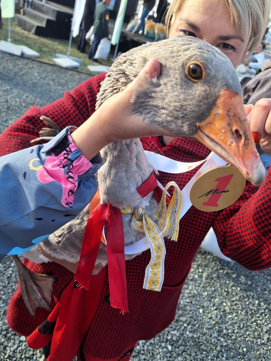 А вот и победитель гусиных бегов, надеюсь он не попадёт в свой приз, морозильную камеру. Он же теперь добытчик!