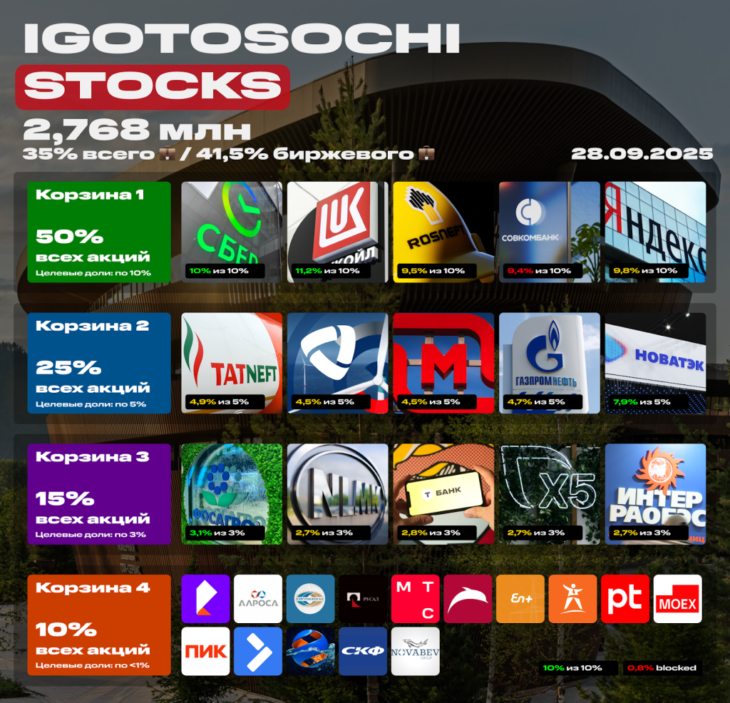 Осень в разгаре, падают листья с деревьев, вот и акции тоже падают. Посмотрел, как идут успехи у портфеля в целом и целевых значений всех акций в отдельности. Размер портфеля составляет 2,768 млн рублей. ⏳ Предыдущий срез был 14 сентября. Акции занимают 35% от всего портфеля (актуальный отчет 1 октября — не пропустите). Если взять только биржевой (без депозитов), это 41,5%. Целевая доля акций в биржевом портфеле 40%, реальная продолжает оставаться выше. 🧮 Учёт веду в специальном сервисе, куда агрегируются все счета. Потратил на акции около 33 тысяч рублей. Про все покупки второй половины сентября писал в отдельном посте. 🕋 Также писал про свой портфель недвижки в отдельном посте, там тоже много нового-интересного, а с тех пор также есть изменения, скоро напишу. По плану у меня была покупка двух акций: Сбер и Яндекс. Дело в том, что в первой половине сентября на акции много потратил и так, а нужно активнее покупать ЗПИФы, поэтому денег было мало, и просадку встретил с пустыми карманам