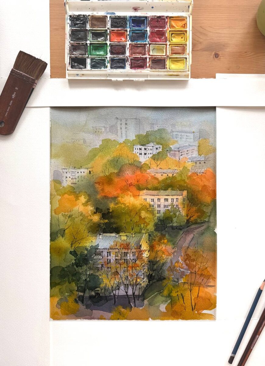 После длительного перерыва я снова здесь 👋 Первые недели осени всегда сложное время для творчества. Уборочная и заготовочная пора😉, начало учебного года и прочее, прочее. Времени не хватает ни на что 😔 И вот я вижу за моим окном - море золота 🍃 Осенняя листва расплескалась повсюду. И в этом море плывут белые пятиэтажки, будто крошечные бумажные кораблики, несущие многочисленные истории и тайны их пассажиров. Линии домов, тонкие стволы деревьев, каскад листьев, падающих вниз - во всем скоротечность момента и вдохновение 🎨 Тут уже я не могла удержаться, чтобы отбросить все дела и взять акварель. Город + осень , новый акварельный мотив 🍃 #watercolorpainting #watercolor #акварель #watercolorsketch #watercolour_gallery #sketh #watercolorart #watercolor_art #aquarella #акварельныйэтюд #акварельныйскетч #пейзажакварель #хрущёвка #панелька #панельныйдом #советскаяархитектура #постсоветское #постсоветскаяархитектура #советскийгород #урбанистика #городскойпейзаж #архитектура #типовойдом #