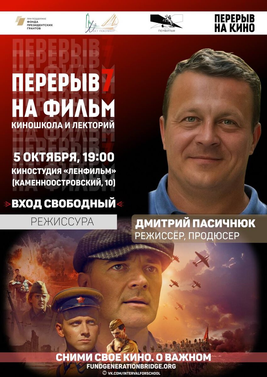 Создание военного веб-сериала от идеи до продвижения | «Перерыв на фильм» 📹 5 октября в 19:00 в директорском зале киностудии «Ленфильм» в рамках VII сезона кинолектория «Перерыв на фильм» пройдет встреча с продюсером и режиссёром Дмитрием Пасичнюком, которая будет посвящена теме создания военно-исторического веб-сериала. Дмитрий Пасичнюк – член Правления Союза кинематографистов России, член Гильдии продюсеров России, в кинематографе с 2004 года. Всего с 2014 года в качестве продюсера снял более 20 сериалов для телеканалов Россия 1, НТВ, СТС, среди которых «Апперкот для Гитлера», «Между нами небо», «Скоро будет счастье», «Принц Сибири», «Проспект обороны», «Конец невинности» и др. Особое место в портфолио спикера занимает авторский проект «Про людей и про войну» - это цикл короткометражных новелл, снятых студией Artel Film, который экранизирует ряд эпизодов Великой Отечественной войны. В свет вышли четыре сезона, набравшие более 170 миллионов просмотров на платформах ВК и Youtube и
