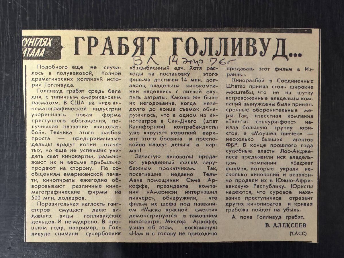 Что только не выпадет из старых книг. Это обнаружилось внутри советской книги о Голливуде. Это к разговору о том, что медиапиратство возникло не с появление цифровых технологий и интернета, а гораздо раньше. Существовало физическое кинопиратство, услугами которого охотно пользовались нечистые на руку кинопрокатчики из Израиля и ЮАР.