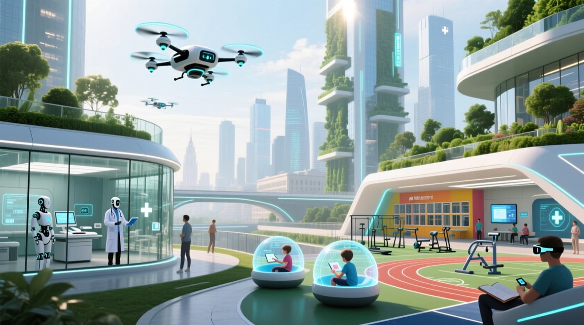 🌆 Москва 2035: здоровье, знания и активность будущего. Часть 2 Москва всегда была городом технологий и скорости . Если раньше мы говорили о транспорте и сервисах, то теперь посмотрим, как город заботится о здоровье, обучении и активности жителей . 🏥 Здравоохранение: медицина всегда под рукой Каждый москвич имеет цифрового медицинского ассистента . Он анализирует биометрию, сон, питание и активность в реальном времени . Пример утра: браслет фиксирует пульс и давление, ассистент подбирает нагрузки и питание, предупреждает о рисках . При необходимости направляет к врачу 🩺. Экстренная помощь доставляется дронами с дефибрилляторами и медикаментами, а медицинские хабы объединяют анализы и консультации разных специалистов . ИИ персонализирует лечение и профилактику, корректируя терапию в реальном времени . 🎓 Образование: школа и университет нового формата Школы 2035 — интерактивные лаборатории и проектные студии . VR и AR погружают детей в предмет . Индивидуальные траектории позво