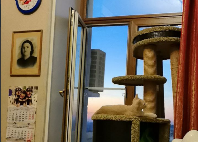 Те же лица, то же небо. Тот же вид из угла, с моего рабочего места. Фото мамы молодой. Часы остановились давным-давно, никак не соберусь поставить батарейку. Да и высоко висят, боюсь рухнуть по дороге. После многих часов за ноутбуком перестаешь понимать, где небо, где земля. Что дома, что на улице. Торчит, перекрывая кусочек неба, старый кондиционер, который подарила на день рождения дочки дорогая редакция. Он спас чью-то жизнь, когда от козырька над домом отвалился кусок этак в десять кило. И попал ровно на него. Однажды у меня побывал человек, работающий с приборами охлаждения, не поверил моему рассказу (булыжник я отдала бригаде ремонтников на память). Но вышел на балкон, посмотрел на старый железный ящик, потрогал и сказал: "Сейчас таких не делают". Кошачий за́мок - случайность. В состоянии полной истерики от того, что кошка задействовала мои плечи для прыжков на гардероб, был приобретен однажды вместо новогодних подарков всей семье. Новая прыгунья оценила. Прицеливается к шторе