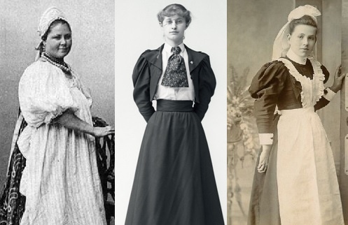 Костюм горничных состоял из платья простого фасона, из темной однотонной материи (шерсти или шелка) со стояче-отложным белым накрахмаленным воротничком, отделанным кружевами или рюшками. Иногда воротничок был твердым накрахмаленным с оборкой. Манжеты тоже были белые и той же фактуры, что и воротничок. На голове горничные носили или наколку из белых накрахмаленных кружев или, реже, накрахмаленный круглый чепчик с двумя короткими «хвостами» сзади.