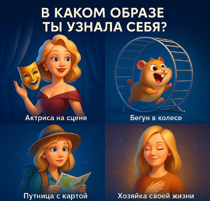 В каком образе ты узнала себя? Иногда мы сами себя удивляем. Живём, действуем, справляемся с задачами, но внутри ощущаем себя абсолютно по-разному и иногда неожиданно для самих себя. Выбери образ, который ближе всего тебе прямо сейчас: 🎭 Актриса на сцене Ты держишь лицо и играешь роль, в которой у тебя всё под контролем. Для других — успешная, сильная, уверенная. Но за кулисами часто прячется усталость, раздражение и вопросы: «А когда уже будет по-настоящему легко?» 🐹 Бегун в колесе Делаешь всё правильно: работаешь, заботишься о близких, поддерживаешь порядок. Каждый день расписан, как по инструкции. Но вместо движения вперёд ощущение бесконечного круга: много усилий, а радости и результата всё меньше. 🗺 Путница с картой Ты ищешь свой путь. Смотришь вокруг, пробуешь, сравниваешь. Иногда находишь подсказки и даже делаешь шаги, но внутри остаётся сомнение, точно ли это твое. И хочется, наконец, увидеть ясный маршрут, а не проверять дорогу методом проб и ошибок. 🏡 Хозяйка св