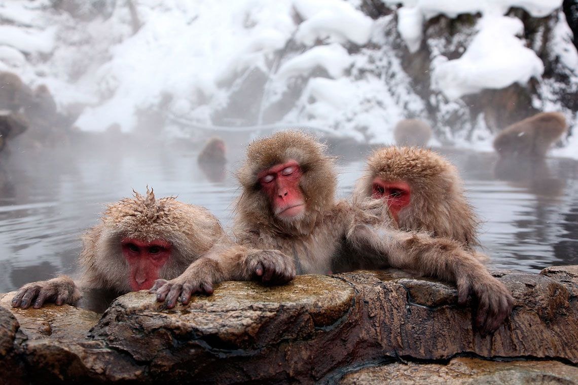 Эти ребята — самые северные обезьяны в мире. Они живут там, где зимой валит снег, и реально холодно. Но, макаки нашли решение: горячие источники!