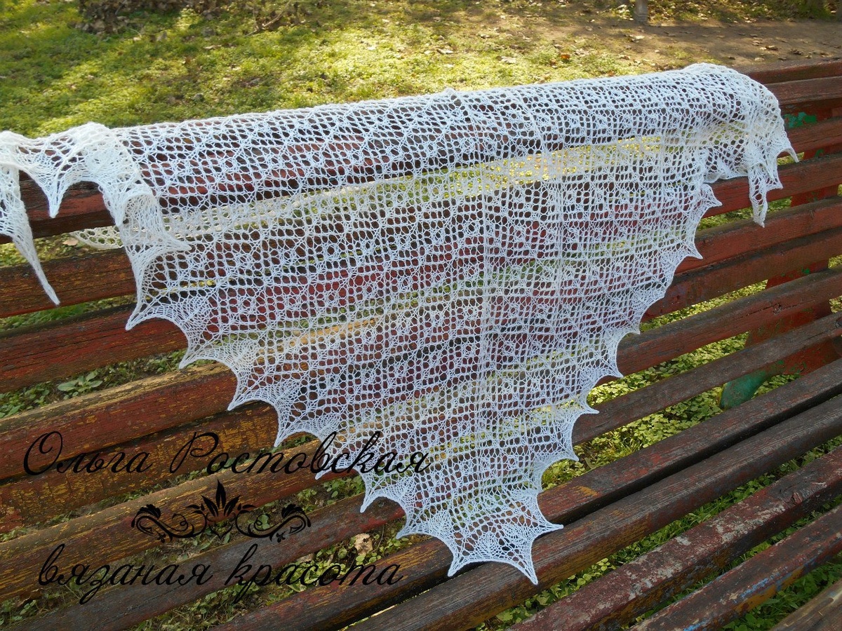 Размер шали может быть изменен, это легко регулируется путем провязывания определенного количества рядов основного полотна или тела шали.