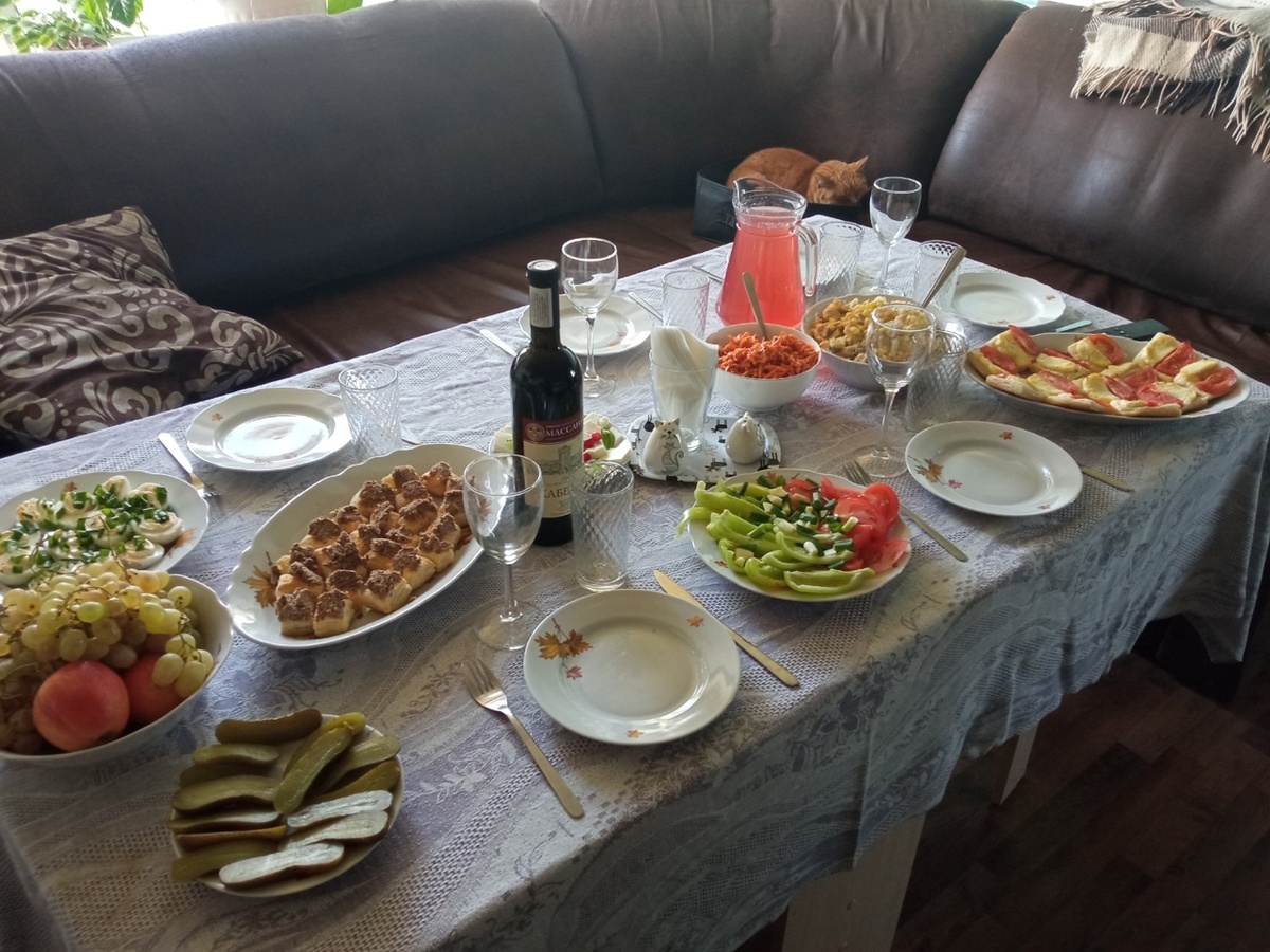 Вчера приходили в гости старший сын со своей девушкой. Я приготовила стол, еды оказалось впору на шесть человек (еще муж, моя матушка и младший сын). Итак, что приготовила. Сначала холодные закуски: Сын любит "Оливье", поэтому сделала его. Я его делаю без горошка (муж не ест) и никогда не использую колбасу, только вареное мясо. (Салата с собой детям в контейнер нагрузила. А еще тр- кабачок. :)). Рядом морковка по-корейски, делаю ее сама, вот рецепт: Ниже простейшее блюдо, но всегда всем нравится - яйца с зеленым луком. (И немножко майонеза). Часто сейчас готовлю для приемов слойки с разными ингредиентами. Например, с беконом. А вчера делала слойки с паштетом из сердца. Я готовила сердце по этому рецепту: В процессе приготовления остались обрезки. Размолола их в блендере с жареным луком, сливочным маслом и черным перцем - и вот он, паштет. А еще вчера сделала слойки с сыром и помидорами. Вообще, любые слойки можно есть и горячими и холодными. Эти были холодными, потому что испекла с
