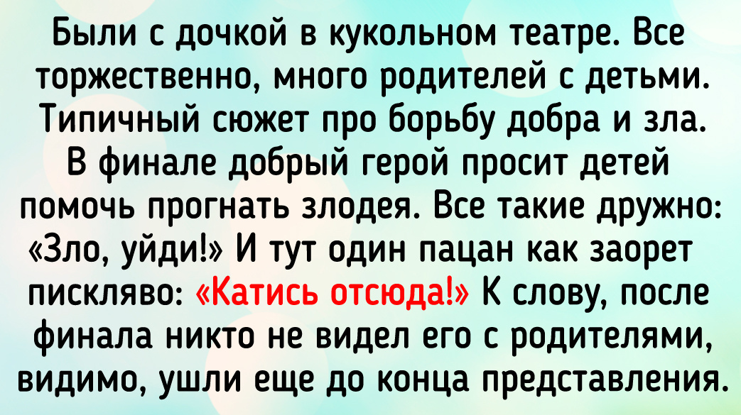 - Были с дочкой в кукольном театре. Все торжественно, много родителей с детьми. Типичный сюжет про борьбу добра и зла. В финале добрый герой просит детей помочь прогнать злодея. Все такие дружно: «Зло, уйди!» И тут один пацан как заорет пискляво: «Катись отсюда!» К слову, после финала никто не видел его с родителями, видимо, ушли еще до конца представления. © Мамдаринка / VK