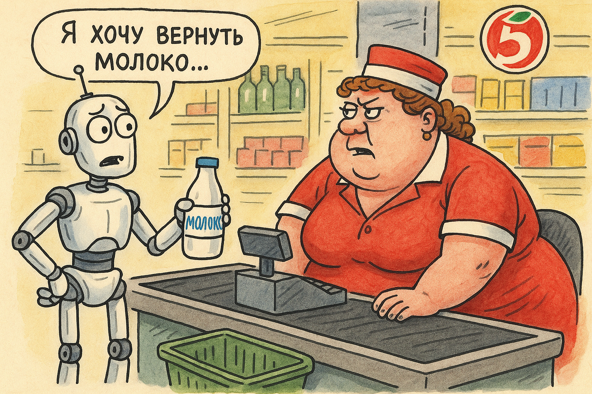 Робот (подкатывает к кассе с пакетом молока): Здравствуйте! Требуется процедура возврата товара. Кассирша Люда: Чего-чего требуется? Робот: Инициирую протокол возврата. Молоко просрочено на 2,7 часа. Люда: Милый, у нас тут не космодром. Говори по-человечески. Робот: Обрабатываю запрос… загружается 30 секунд… ХОЧУ ВЕРНУТЬ МОЛОКО, ОНО ПЛОХОЕ! Люда: Не ори на меня, железяка! Чек есть? Робот: Чек сохранён в облачном хранилище. Могу спроецировать голограмму. Люда: Давай бумажный, умник. Робот (печатает чек из встроенного принтера в животе): Распечатано. Качество печати 1200 dpi. Люда: Так… А покупали-то вчера! Чего ж вы сразу не проверили? Робот: В моей базе данных отсутствовала информация о необходимости проверки срока годности. Обновление получено только сегодня в 3:47 утра. Люда: Заведующую позвать? Робот: Анализирую иерархическую структуру… Да, требуется эскалация на следующий уровень поддержки. Заведующая Галина Петровна (подходит): Что за шум? Робот: Добрый день! Вы — админ этой локац
