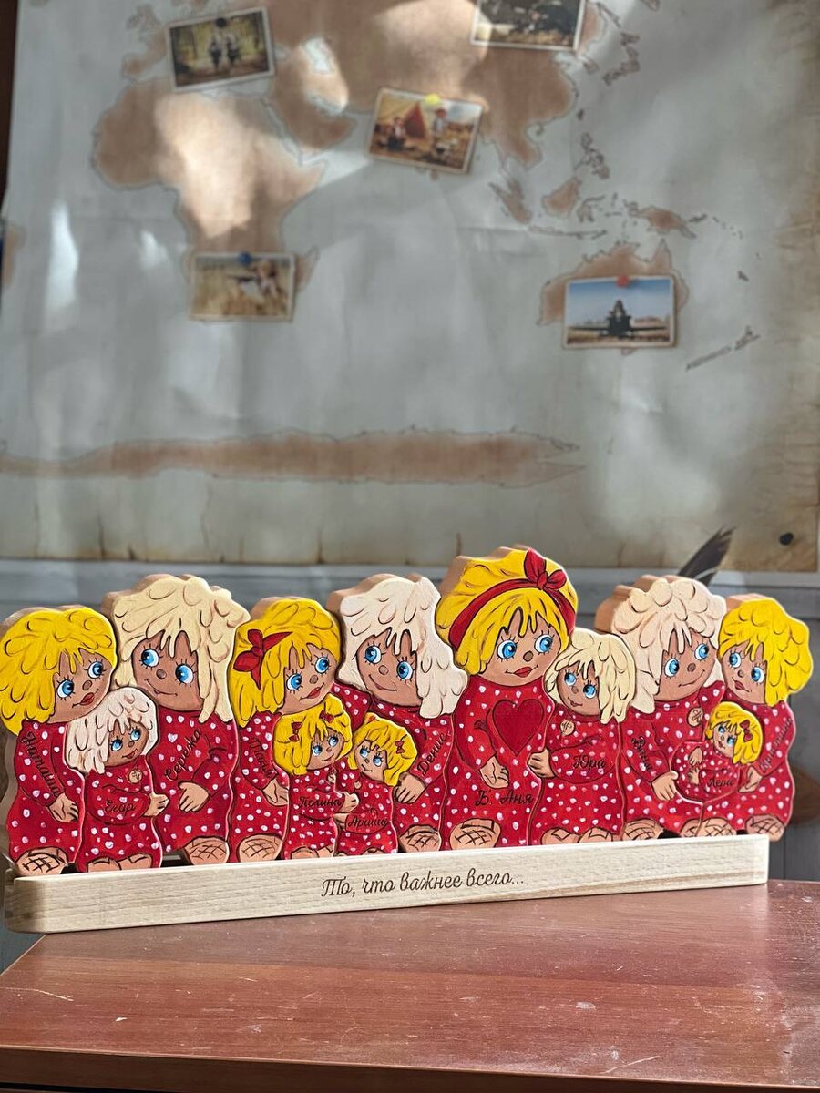 Обычно в одном пазле мы собираем от 2 до 4 поколений — бабушки, дедушки, родители, дети, иногда даже правнуки. Так получается целая родословная семья в одной композиции. Домовые — отличный символ уюта и семейного очага, поэтому они особенно подходят для таких пазлов с несколькими поколениями.
