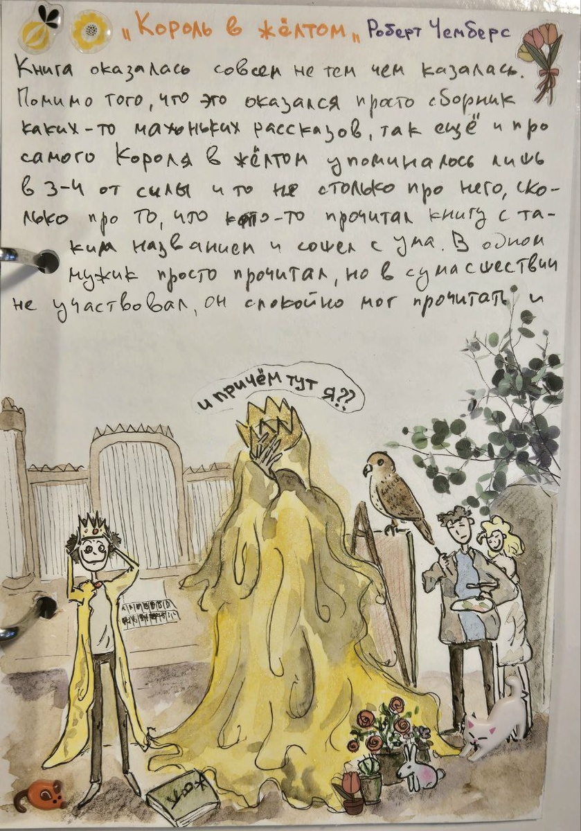 Книга оказалась совсем не тем чем казалась. Помимо того, что это оказался просто сборник каких-то махоньких рассказов, так ещё и про самого Короля в желтом упоминалось лишь в 3-4 от силы и то не столько про него, сколько про то, что кто-то прочитал книгу с таким названием и сошел с ума. В одном мужик просто прочитал, но в сумасшествии не участвовал, он спокойно мог прочитать и новостную газету, ничего бы не поменялось. Сами рассказы между собой не связаны, но в них промелькивают имена или места, из других рассказов. Но при этом хронология полностью нарушена. Вот написано, что это первый рассказ, но он в середине книги, вот тут война и всех убили, а в следующем это же место и люди, но ещё до разрушений. Непонятно. И да, где Хастур то?! Нафига там рассказы про бухающих художников и их любовь к дамам несложного поведения?! Я же не для этого книгу то читала. Из всех мне понравился лишь первый рассказ, где реально мужик сошёл с ума и пожалуй рассказ про художника, что видел сон про себя. Ра