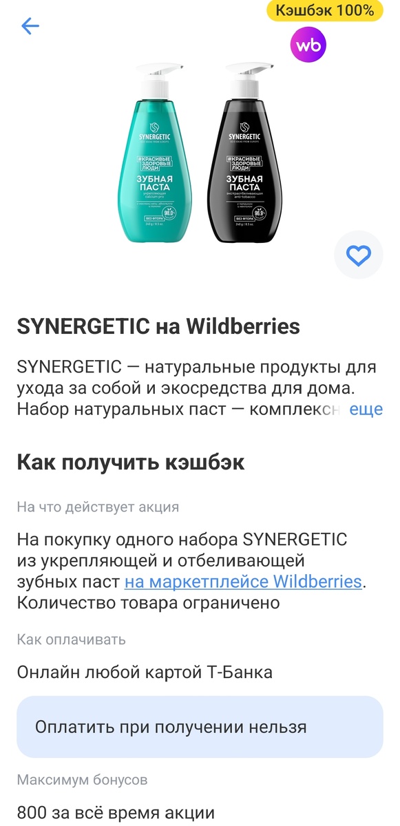 Сегодня Т-банк предлагает очень выгодный кэшбэк на зубную пасту. Возвращают не более 800 рублей, у меня она обошлась 769 рублей. Еще 100 % кэшбэка вернут за 1 сырок: И кошачий корм: У кого нет еще карты Т-банка, рекомендую оформить. До 5 октября банк будет каждый день предлагать товары со 100% кэшбэком. Можете получить дополнительно 500 рублей, если оформите ее по этой ссылке.