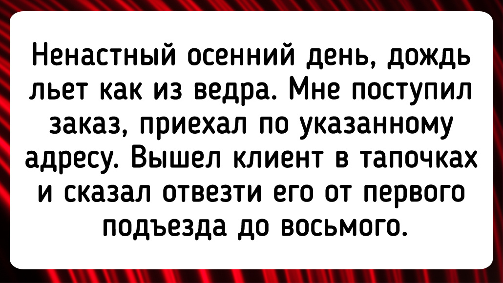 Ну а вышли мы в 100 метрах от дома. © ПОЗОР / VK - Ненастный осенний день, дождь льет как из ведра. Мне поступил заказ, приехал по указанному адресу. Вышел клиент в тапочках и сказал отвезти его от первого подъезда до восьмого. © Подслушано