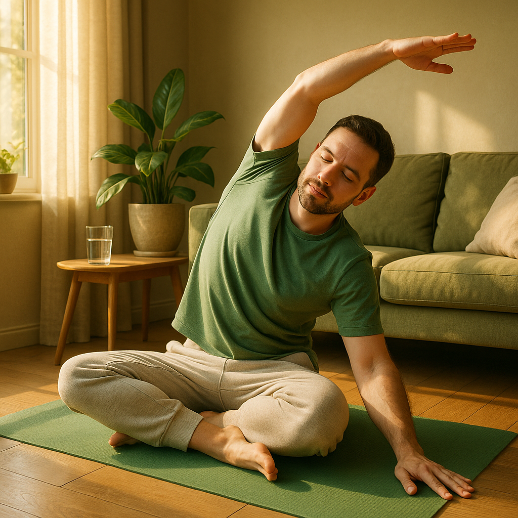 Встаньте, ноги на ширине плеч, вдохните и медленно потянитесь руками к потолку, словно хотите достать звёзды. Выдохните, опуская руки. Повторите 10 раз. Это пробуждает мышцы и разгоняет кровь. 2. Наклоны корпуса (3 минуты)