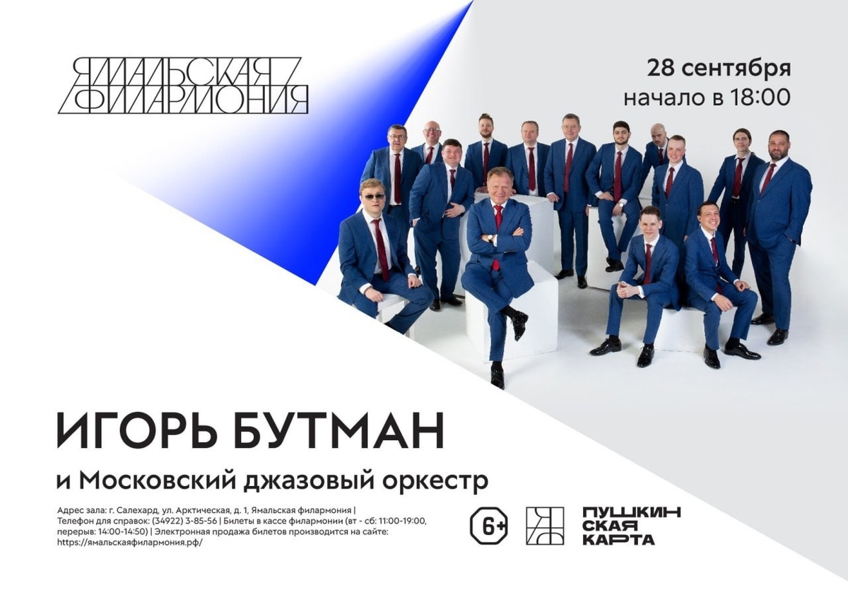 🎵 СЕГОДНЯ! Лучший джаз ждёт вас! Московский джазовый оркестр Игоря Бутмана выступит в Ямальской филармонии сегодня в воскресенье. В 18:00 встречаемся с любимыми мелодиями в джазовой аранжировке! Подарите себе два часа чистейшего удовольствия. Успейте купить билеты в кассе или онлайн: https://quicktickets.ru/salehard-yamalskaya-filarmoniya/s689