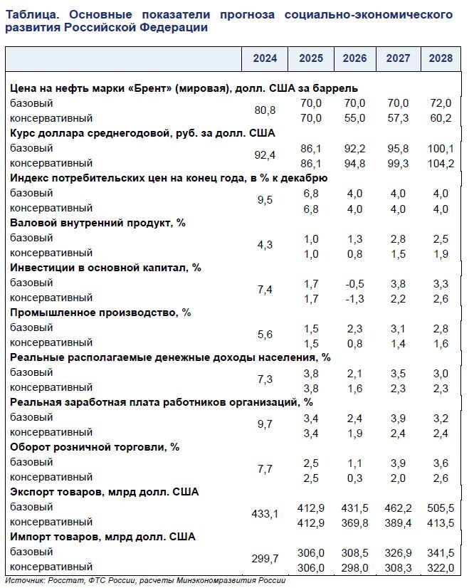 Для начала, стартовые условия, 2025-й год. В прошлом году минэкономразвития закладывал в бюджет-2025 рост ВВП на 2,5% и инфляцию 4,2%. Теперь прогноз Минэка для 2025 намного хуже: 1% и 6,8%. Промах колоссальный. Но, правительству как-то удалось заболтать Путина (который и «сам обманываться рад») и публичных претензий к нему «сверху» нет. А если учесть обман Росстата — то выстрел прогноза-2025 вообще «в молоко». По нашим оценкам ВВП России давно у отрицательной зоны (как минимум), и инфляция двузначная. Уже только поэтому нас не очень интересует прогноз правительства на 2026 год — он не имеет отношения к реальности даже на уровне тенденций. Но все же стоит понимать, что предлагается «на витрину» Путину. В экономике, по мнению правительства, все будет нормально. Да, конечно, замедление ВВП налицо (с 4% в 2024 до 1% в 2025 и 1,3% в 2026). Но инфляцию в будущем году задавят до 4%. И в дальнейшем рост якобы разгонится до 2,8% в 2027 и 2,5% в 2028. При том, что инфляция останется на том же у