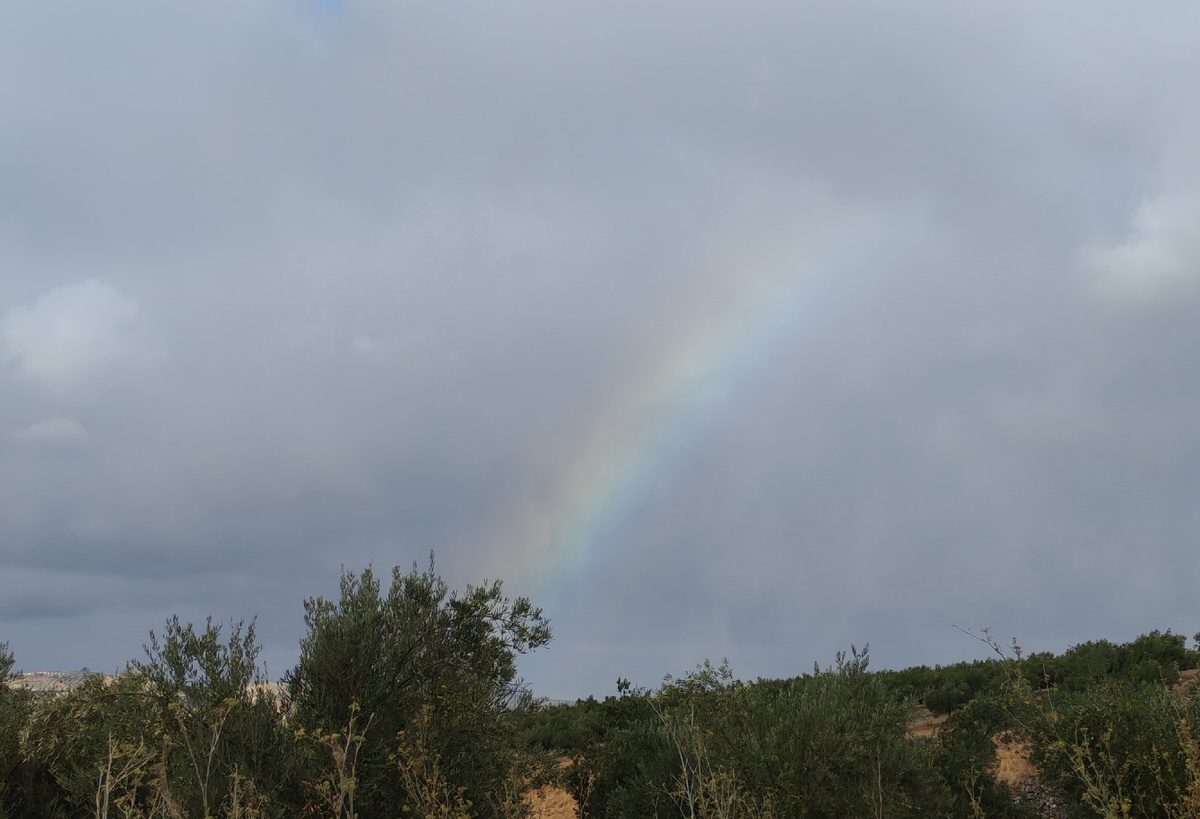 Короткий и ровный этап вдоль реки Гуадахос. Видим и идем на радугу, которая предвещает дождь. Вышли в 07.15. На выходе из Баены прошли мимо необычного сооружения в центре круговой развязки Нашли указующий Путь Мозарабе столбик Сначала около километра по краю автотрассы (несмотря на воскресенье, машин было не мало). Затем свернули на грунтовку, взобрались на холм и обернулись, чтобы посмотреть на предрассветную Баену. Температура +17, на небе облачность. Идти комфортно, особенно вниз. Изредка слышим выстрелы. Воскресенье - время охоты. Поднимаясь на очередной холм, видим стоящего за оливой охотника. Приклад уперт в верхнюю часть бедра, ствол вверх. На просьбу о фото молча покачал пальцем - ни-ни. Всем видом показал - иди отсюда, не мешай. Мы снова топаем через бесконечные оливковые рощи Дошли до моста Матурра через реку Гуадахос. Мост длинный, справа и слева от него высажены оливы, и только в конце находим ручей шириной не более 2-3 метров. После моста сворачиваем налево. Тут есть бесе
