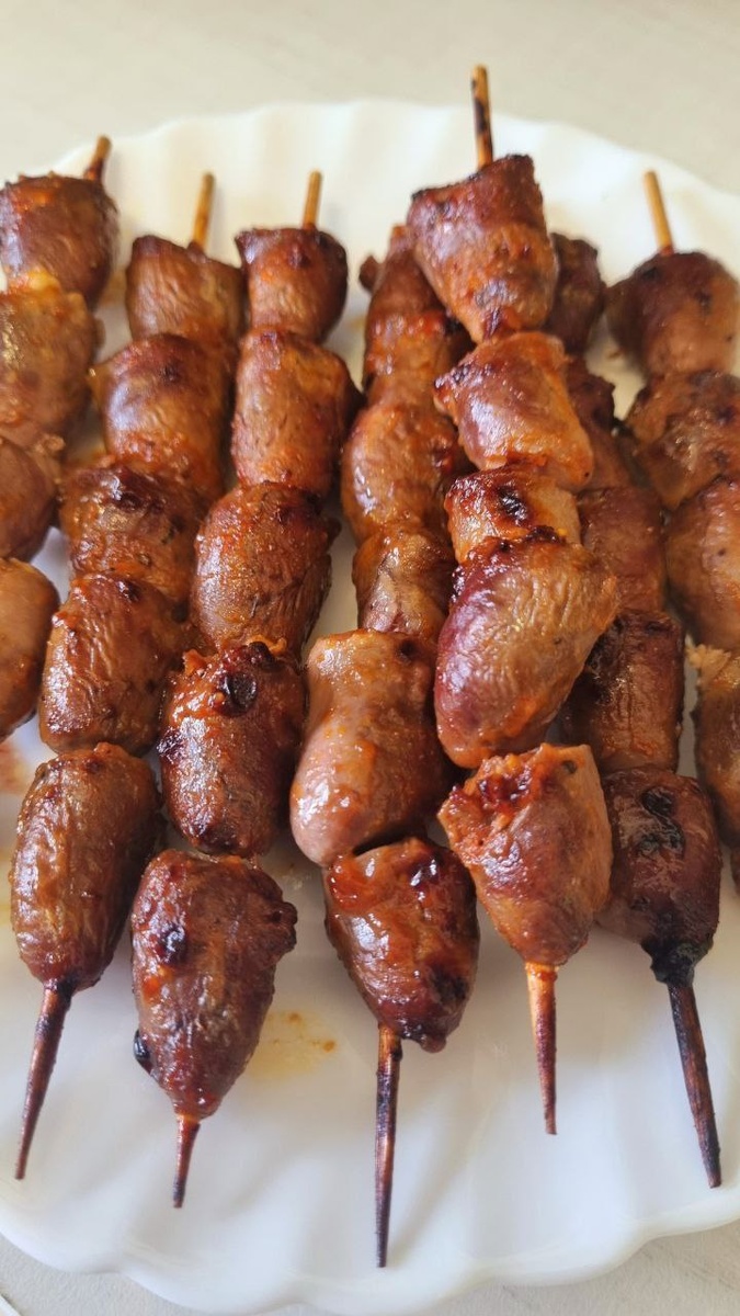 Шашлык из куриных сердечек. 👉 От куриных сердечек отрезаем все лишнее ( жир и трубки). Маринуем в соевом соусе, томатной пасте (кетчупе), специях (паприка, соль, перец) и 1 ст. л. растительного масла. Оставляем мариноваться на 30 минут. Готовим при 190° 10 минут в аэрогриле #ужин #закуска #аэрогриль