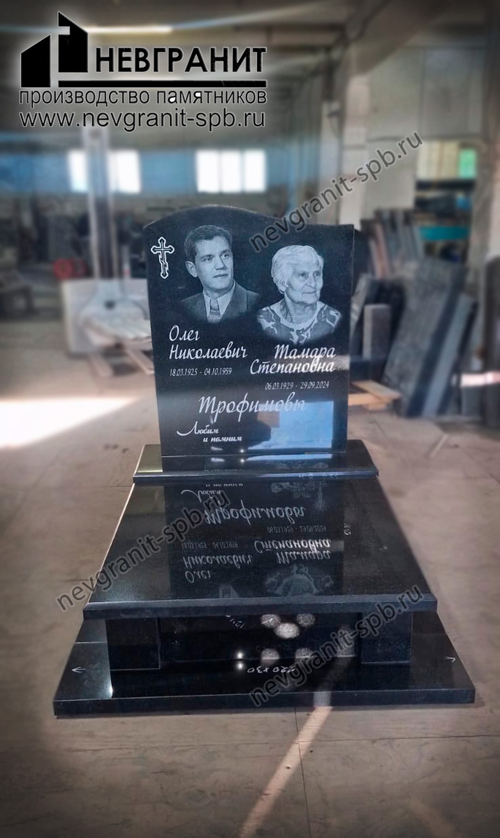 На фотографии представлен впечатляющий надгробный памятник, созданный компанией «Невгранит», увековечивающий память Олега Николаевича (18.03.1925 – 04.10.1959) и Тамары Степановны (06.07.1929 – 29.09.2024) Трофимовых. Этот монумент, выполненный из черного гранита, сочетает в себе классическую строгость и глубокий символизм. Памятник состоит из нескольких ярусов. Верхний ярус – это вертикальная плита, на которой расположены портреты Олега Николаевича и Тамары Степановны. Оба изображения выполнены с высоким качеством гравировки, позволяющим сохранить индивидуальные черты лиц. Над портретом Олега Николаевича изображен крест, что может указывать на вероисповедание семьи. Под фотографиями выгравированы имена, фамилия и даты жизни усопших. Под фамилией выгравирована надпись "Любили и помним", что является очень трогательной деталью. Ниже располагается массивная гранитная тумба, а под ней - ещё один ярус, на котором можно заметить отраженные надписи с верхнего яруса, это создает эффект глуб