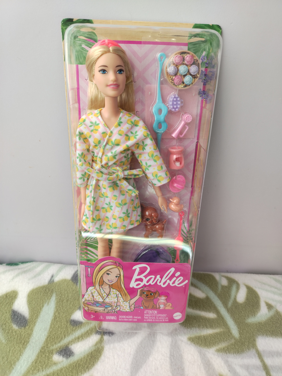 У меня давно уже в отложенном была эта кукла, я планировала ее как донора, и вот, наконец-то, ее можно было приобрести по очень приятной цене: Мордашка у нее умилительно-кривенькая, сильно отличается от того, что показывают промо-фото. Но, если бы не уехавший вверх рот и не дыры в коленях, то эта кукла была бы очень даже ничего (правда, самая главная ее особенность вскроется чуть позже). Идет с целым набором "банных" аксессуаров. В том числе, вот с такой "супергеройской" маской. Если честно, то собачья маска нравится мне гораздо больше. Непонятно, зачем кукле сделали разрезы для глаз. У нее милый махровый халатик с узорами из лимонов. Это, прям, хорошая такая вещица. И тут, вдруг, самое большое откровение. А кукла-то лысая. Зачем ей сделали плешь, совершенно непонятно - ободок и так спокойно садится на кукольную голову: Волосы можно зачесать назад, но выглядит все это крайне странно. Ну и самое главное, ради чего я ее покупала - подойдет ли она по скинтону моей Одили? Но увы, она розов