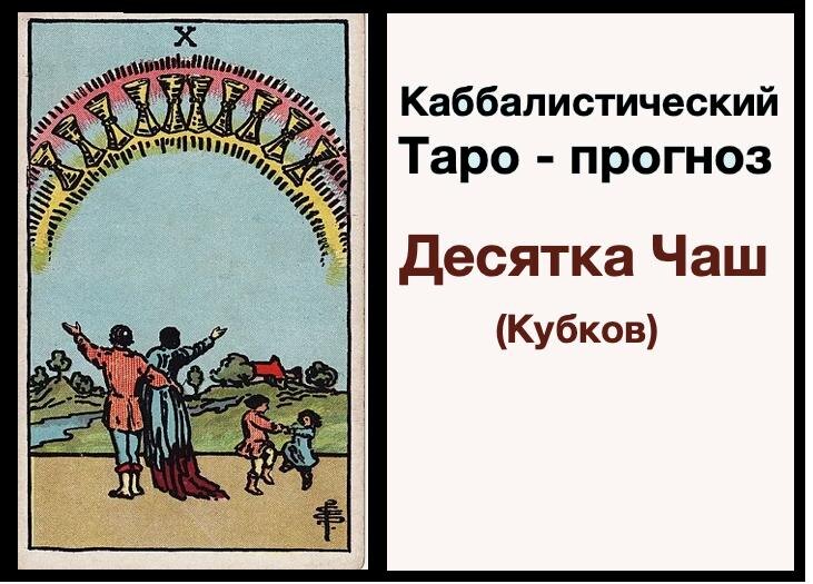 Карта и Аркан каббалистической системы Таро: Десятка Чаш. Прогноз Системы Таро предназначен исключительно для жителей России. Если вы читаете эти строки, значит, Вселенная посылает вам знак — прислушайтесь к нему внимательно. Обратите внимание на проявление энергий Аркана Десятки Чаш в вашей жизни и используйте его советы, чтобы избежать негативных ситуаций. Девиз Аркана Десятка Чаш: Повелитель Совершенного Успеха. Я не буду нуждаться ни в чем. Аркан Десятка Чаш символизирует удовлетворение, преисполнение и излучение. Однако ваш внутренний мир может оказаться выставленным напоказ, вызывая оценку со стороны окружающих. Высокочастотные вибрации Аркана Десятки Чаш проявляются как счастье, радость, удовольствие, мир, удовлетворение собой, хорошая семейная жизнь, почёт, уважение, добродетель и отличная репутация. Энергия Аркана приносит почести, богатство и счастье, открывает доступ к «светлой голове», живости ума, интеллекту и дипломатическим способностям. Низкочастотные, негативные энерг