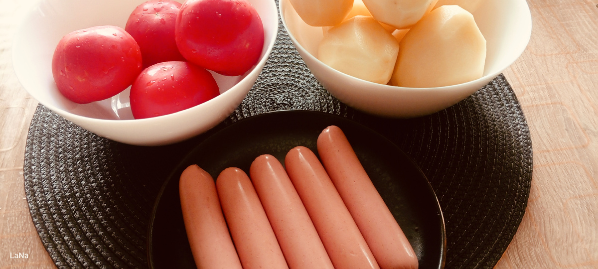 Продукты, помыть, почистить, нарезать, некрупными квадратиками, сосиски кружочками потолще.