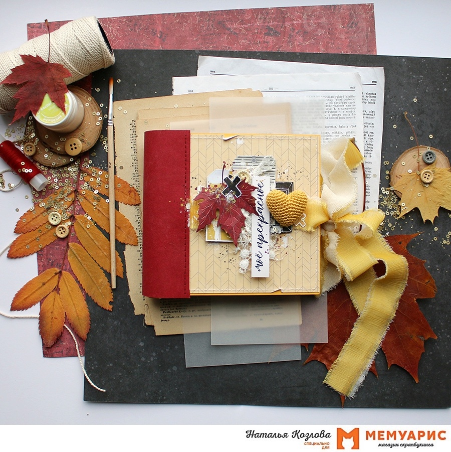 Друзья, привет! С вами Наташа, и сегодня хочу полистать свой осенний альбом. А мотивировали меня на его создание золотая осень и наше задание «Цитатник». Вдохновляемся мы цитатой А.С. Пушкина «И с каждой осенью я расцветаю вновь...» Альбомчик вышел замечательным! Малыш размером 13*13 см в бумажном переплёте. Заглавными стали строки «Люблю я пышное природы увяданье, В багрец и в золото одетые леса…». Поэтому и цветовую палитру я выбрала соответствующую: бордо, желтый и оранжевый. А для контраста у меня чёрный. На обложке композиция из тегов Ленскрапа, рамки Paper Home и надписи из «Говорилки картонной. Дети». А изюминкой здесь являются вязаное сердце и нежнейшие завязки из лент. Основы страниц альбома из пивного картона, торцы которых я покрасила меловой краской от Fractal paint. Ну и наконец заглянем в альбом и полистаем его. Вот и первый разворот. На фон оформленных страниц использовала черную клетку из коллекции «В объятиях зимы», листы из набора «Мир фантазий», а также жёлтые листы